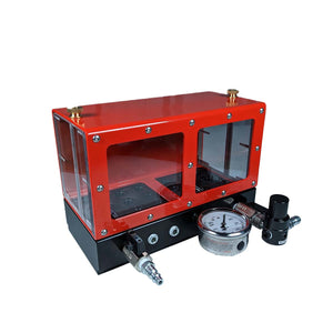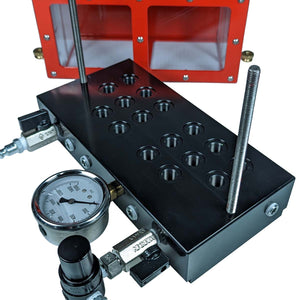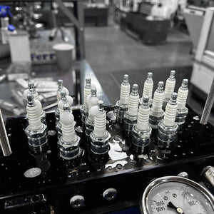 Simply install all 16 spark plugs into the base and spray a soapy water mix onto the plugs. Place the containment shield on top and secure it for safe operation. Connect to your shop air or CO2, build pressure, and inspect for any leaks through the front window.